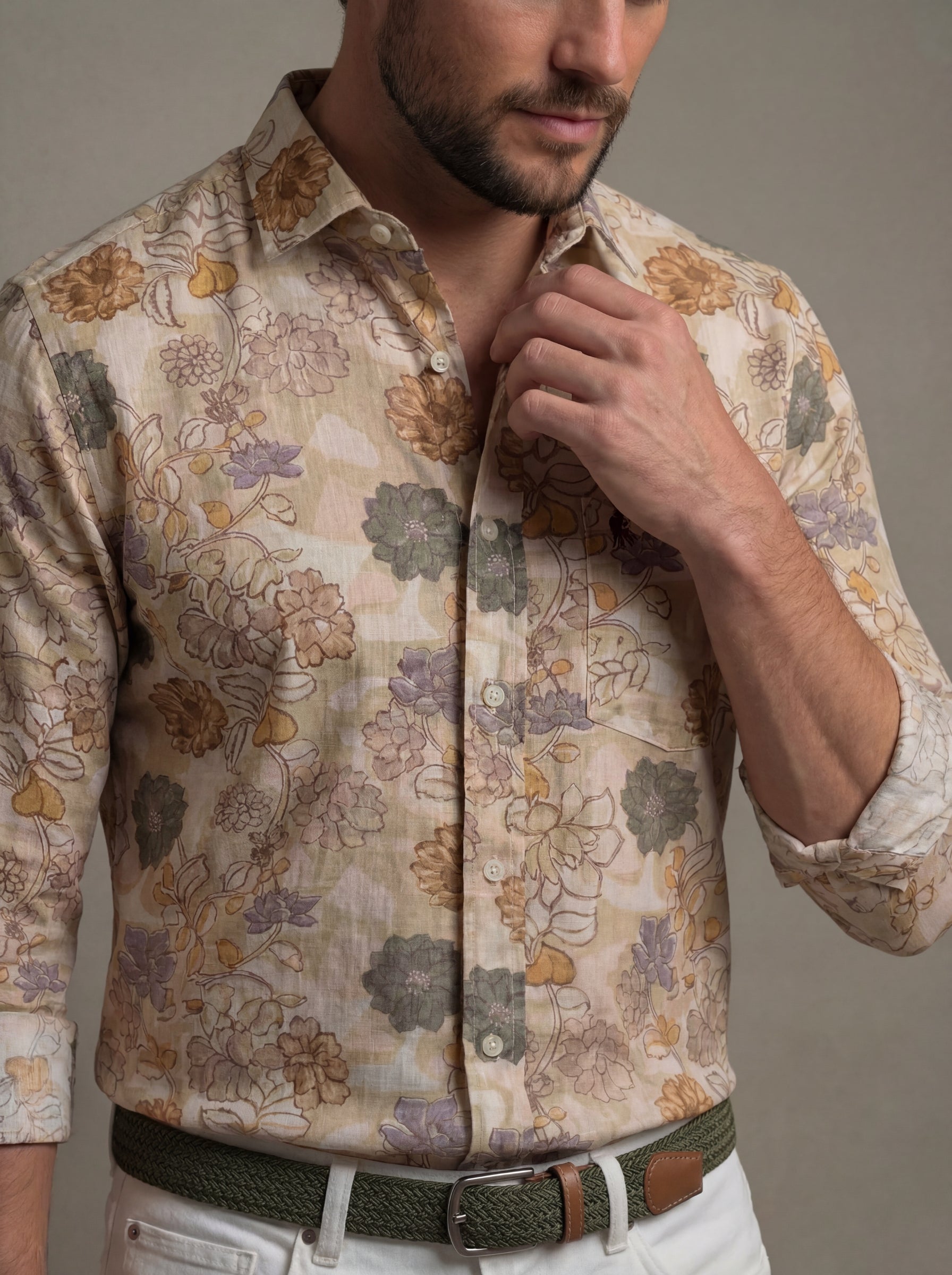 Aberg Slub Beige Printed Full Sleeve Tailored Fit Casual Cotton Shirt
