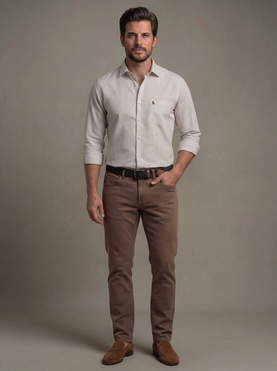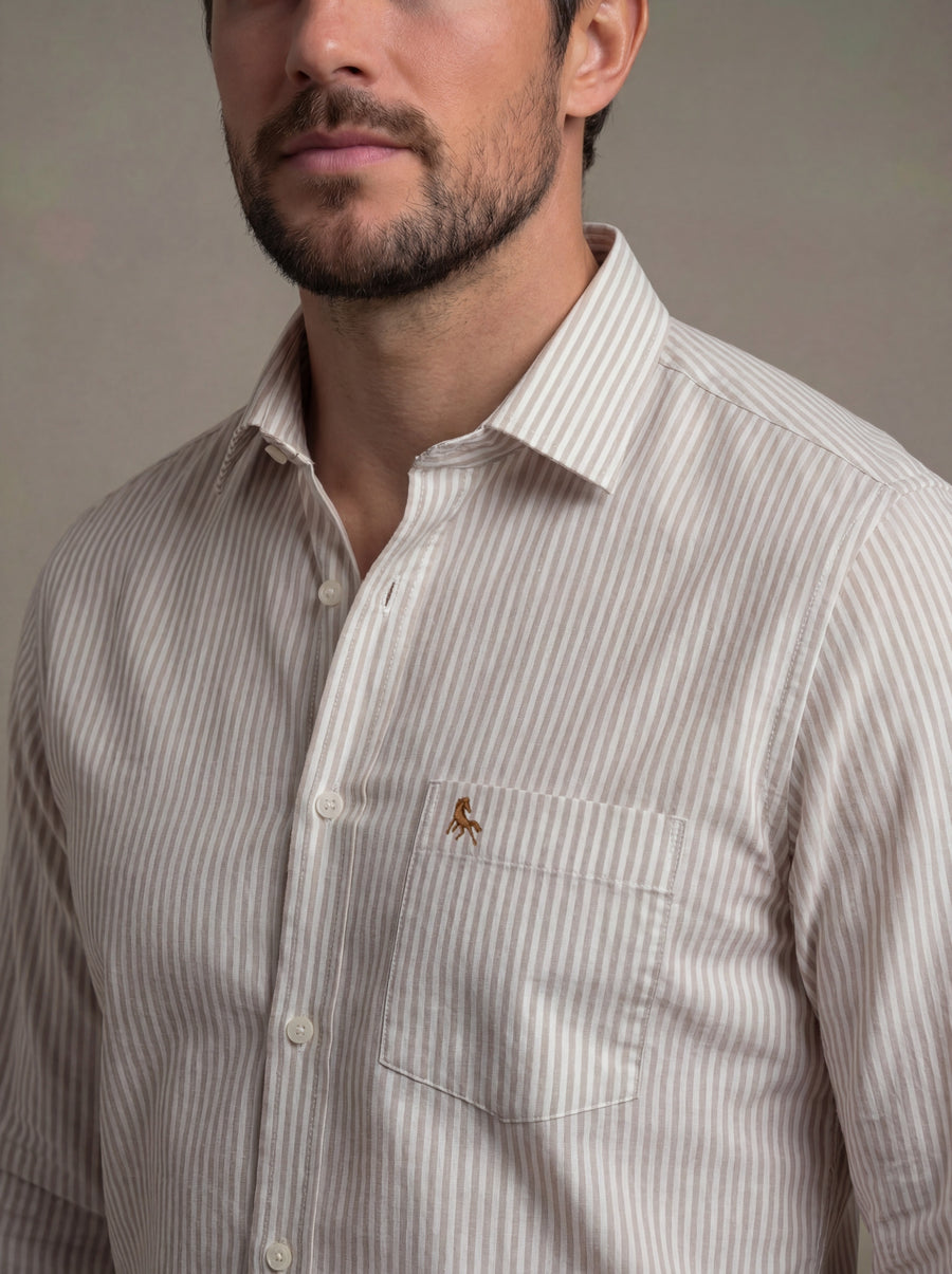Silba Oxford Beige Striped Full Sleeve Tailored Fit Casual Cotton Shirt